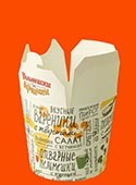 Такой формат WOK упаковки удобен для фастфудов для хранения и транспортировки салатов и других блюд, которые едят холодными, так как термосклейка не дает возможность нанести металлизированное покрытие на внутреннюю поверхность.