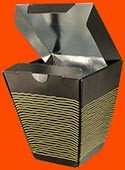 Такая упаковка при транспортировке занимает минимум места. Благодаря тому, что при изготовлении такой коробочки не используют термосклейку, на ее внутреннюю поверхность можно нанести металлизированное покрытие, которое помогает продолжительное время сохранять высокую температуру.