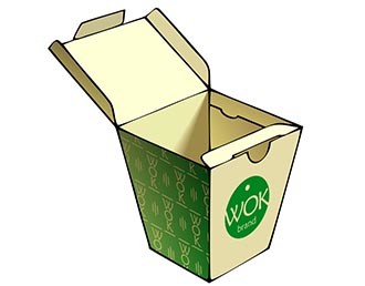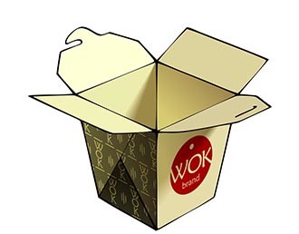 Коробка-оригами - это классика упаковки для блюд WOK. Конструкция ее была изобретена еще в конце 19 века в США, и с тех пор совершенствовались, в основном, только материалы, из которых изготавливается упаковка. Первоначально ее вырезали и складывали из промасленной бумаги. В дальнейшем развитие технологий позволило наносить на неё полиэтиленовое покрытие и полноцветное изображение. В конце концов, появление металлизированного покрытия сделало эту конструкцию идеально функциональной и дешёвой упаковкой для горячих блюд. Именно поэтому усовершенствованная коробка-стакан до сих пор не может полностью вытеснить оригами с рынка WOK.