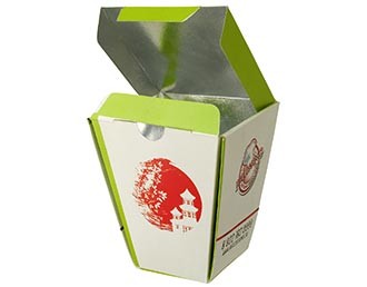 Такая упаковка при транспортировке занимает минимум места. Благодаря тому, что при изготовлении такой коробочки не используют термосклейку, на ее внутреннюю поверхность можно нанести металлизированное покрытие, которое помогает продолжительное время сохранять высокую температуру.